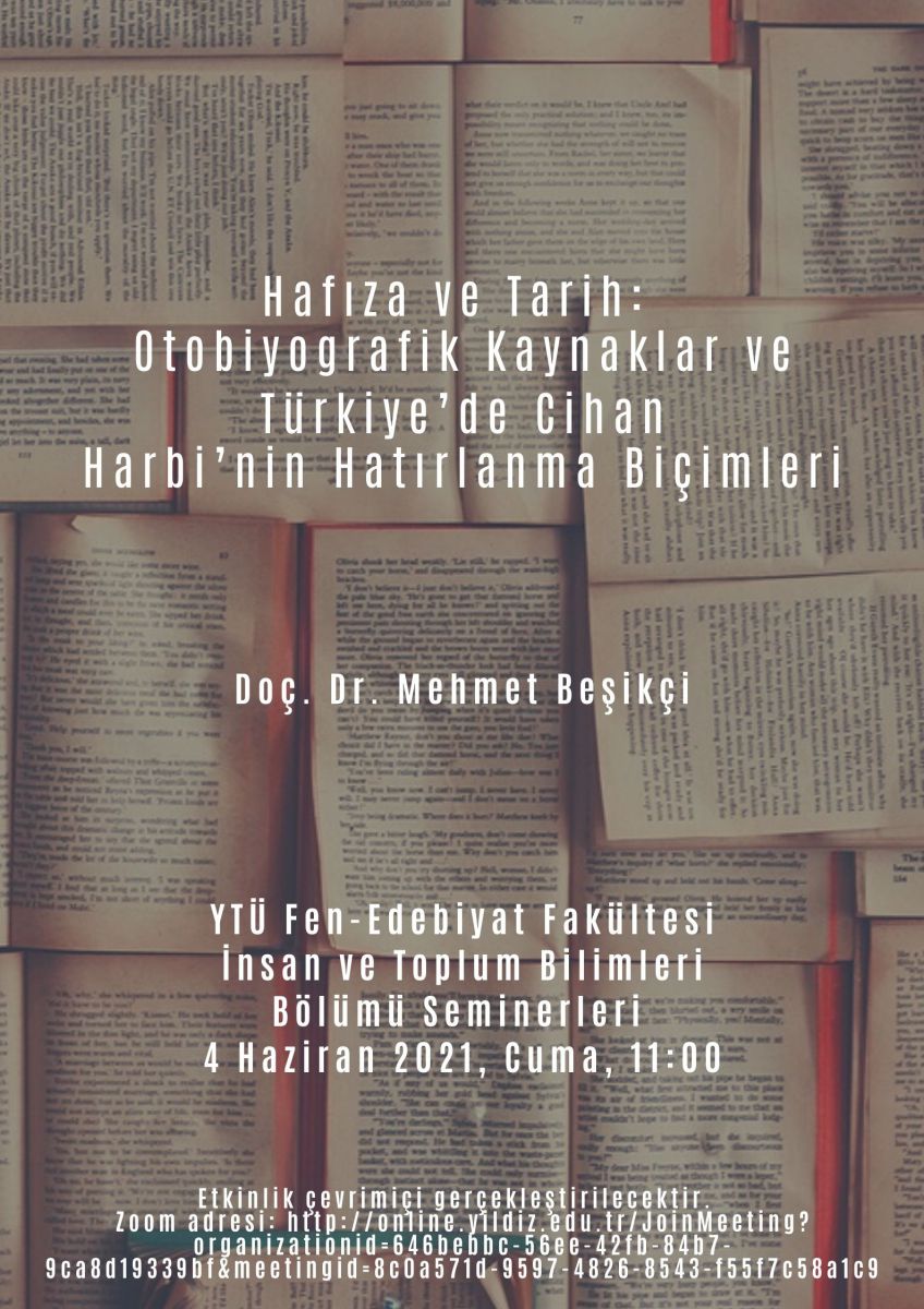 Fen-Edebiyat Fakültesi Akademik ve Kültürel Etkinlikleri kapsamında İnsan ve Toplum Bilimleri Bölümü tarafından düzenlenen Doç. Dr. Mehmet Beşikçi’nin sunacağı ''Hafıza ve Tarih: Otobiyografik Kaynaklar ve Türkiye’de Cihan Harbi’nin Hatırlanma Biçimleri'' konulu seminere katılımınızdan memnuniyet duyarız.